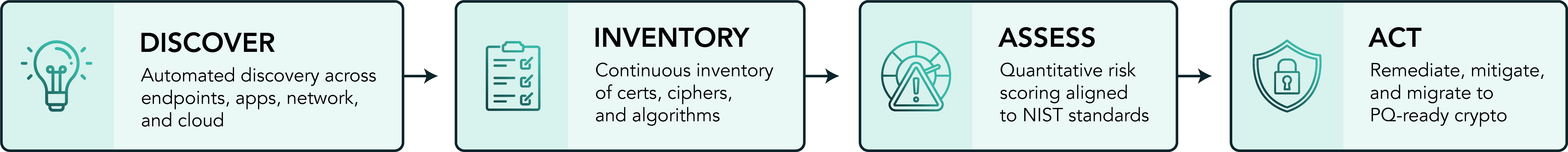 - Automated cryptographic inventory and continuous dynamic detection of algorithms, key lengths, certificates, libraries, cipher suites, and PQC and methods.